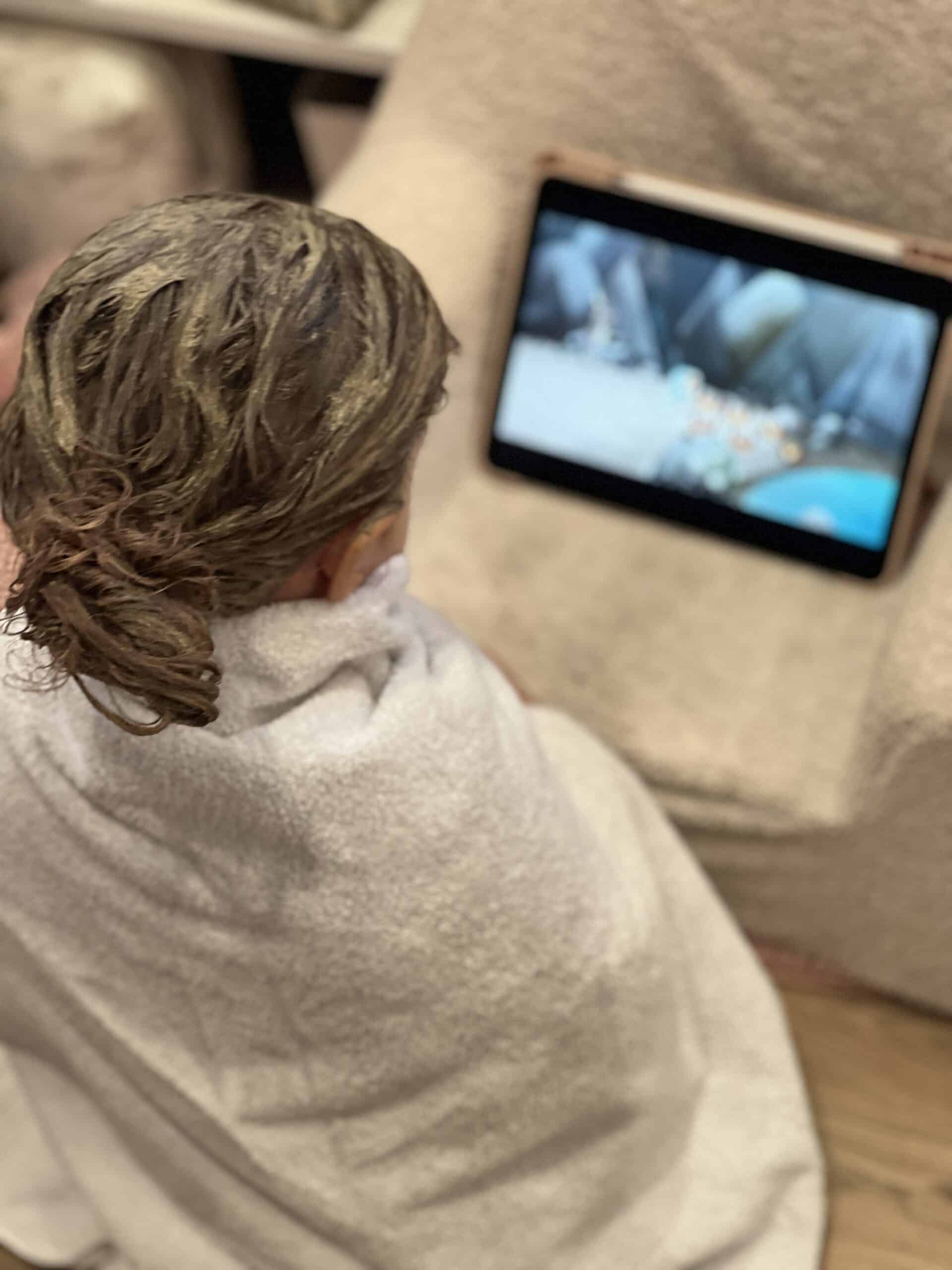 Je l’installe devant un dessin animé le temps de lui appliquer sur les cheveux et pendant la pose, et ensuite direction la douche ou le bain pour rincer et voir à quel point c’est « rigolo » de voir l’eau changer de couleur.